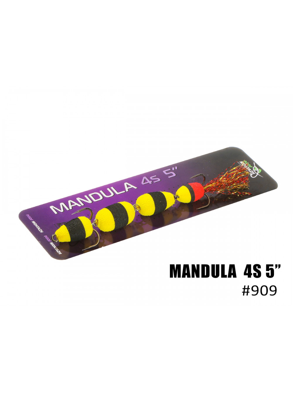 Мандула 4S 5" 125мм - складається з 4 частин тіла, що забезпечують відмінну жвавість гри приманки, оснащується двома гострими трійниками 2 та 4 номеру. Хвіст мандули оснащений кольоровою опушкою з люрексу.